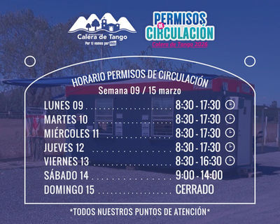 Finalmente, informamos que durante el mes se irán ampliando progresivamente los días y horarios de atención presencial, con el objetivo de facilitar que todas y todos los vecinos puedan realizar su trámite de manera oportuna. Los horarios actualizados serán informados a través de los canales oficiales de la Municipalidad de Calera de Tango.